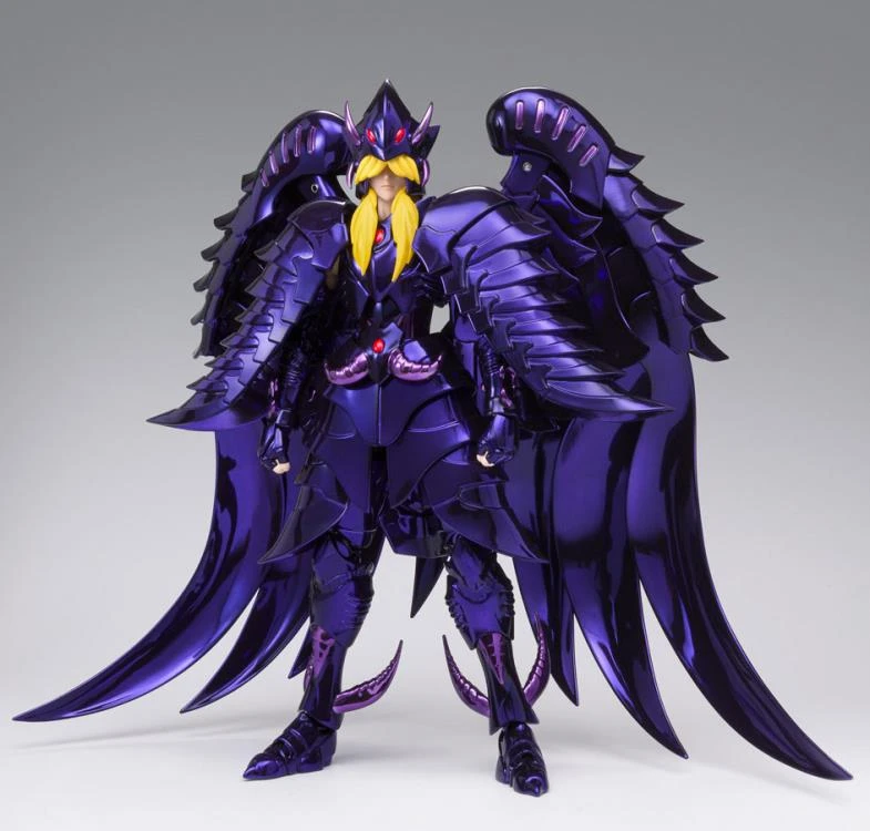 From the classic Saint Seiya anime comes Griffon Minos in his original armor colors! This beautiful figure includes the Surplice, frame for object form, along with interchangeable facial expressions, hands, and parts to display him with or without his mask.