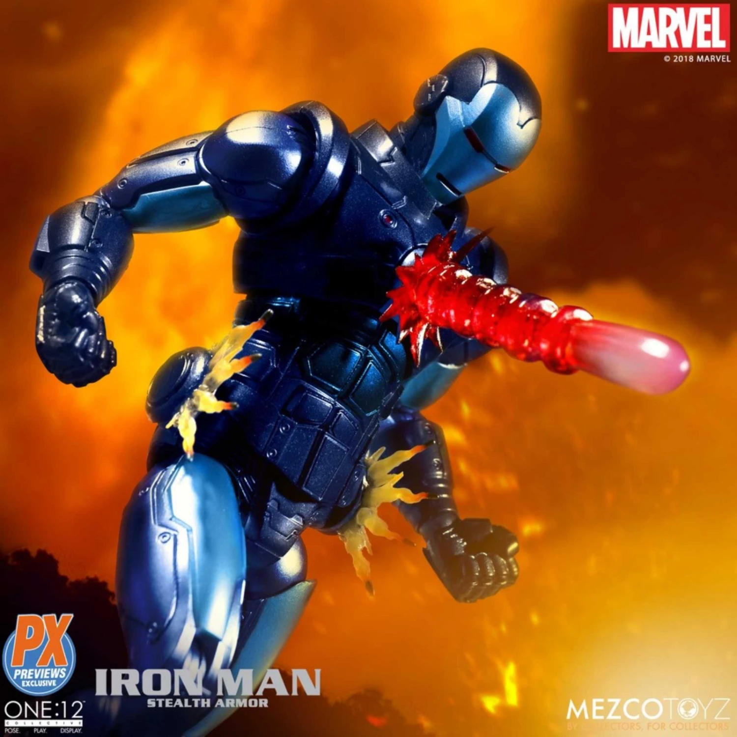 The One:12 Collective Stealth Armor Iron Man features a specially sculpted One:12 body specifically created for Iron Man and is designed with real metal components! His articulated visor can be worn in the standard closed position or opened to reveal the face of billionaire Tony Stark. The figure comes complete with an array of blast effects, as well as gauntlet rockets and hip rockets that can be interchanged with his hip discs. His signature arc reactor, the source of Iron Man’s power, has a light up feature (battery included).